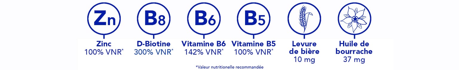 *De Phyto Paris. (1)Le zinc contribue au maintien de cheveux et ongles normaux. La vitamine B6 qui contribue à la synthèse normale de cystéine. (2)Le zinc contribue aussi à une synthèse protéique normale
