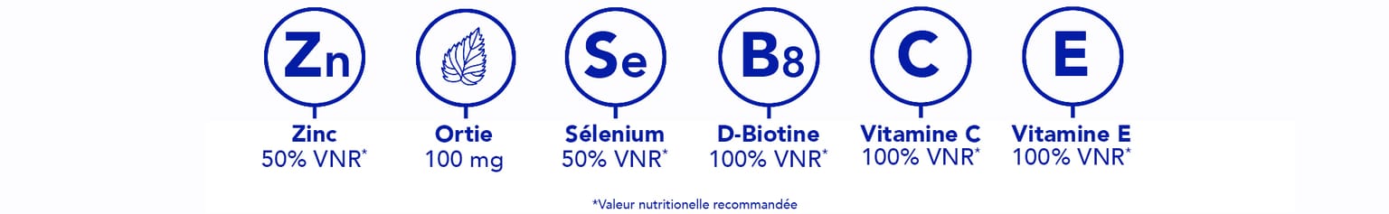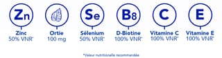 *N°1 en rotation unitaire sur le marché des phanères en sell out 2024 GERS. (1)Le zinc contribue au maintien de cheveux et ongles normaux. La vitamine B6 qui contribue à la synthèse normale de cystéine. (2)Le zinc contribue aussi à une synthèse protéique normale. (3)Etude clinque, 104 volontaires, 3 mois, 2 capsules par jour, % de satisfaction