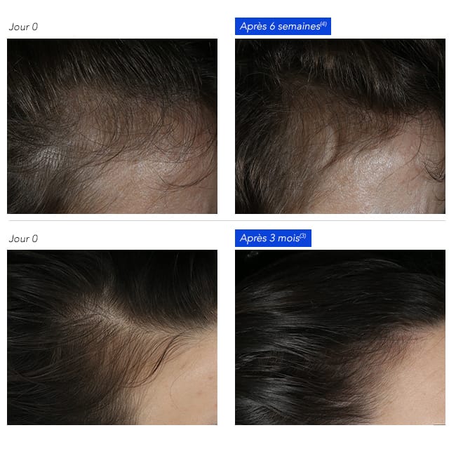 (1)Etude clinique, 52 femmes, 1 mois - % de satisfaction. (2)Etude clinique, 40 femmes, 3 mois – cas n°12 représentatif de la moyenne de l’augmentation de la densité. (3)Etude clinique, 52 femmes, 3 mois - test de traction capillaire. (4)Etude clinique, 52 femmes, 6 semaines - % de satisfaction.