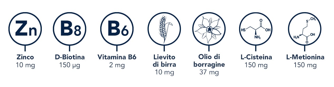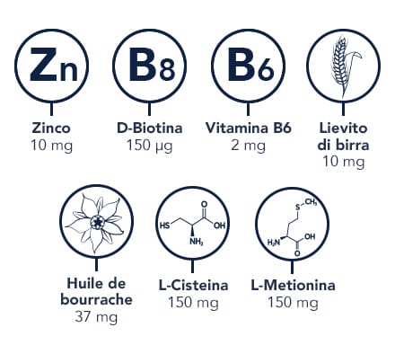 Un oligoelemento essenziale per la sintesi della cheratina e la crescita dei capelli e delle unghie. Contribuisce alla normale sintesi proteica. Aiuta inoltre a preservare i bulbi dall'invecchiamento precoce.