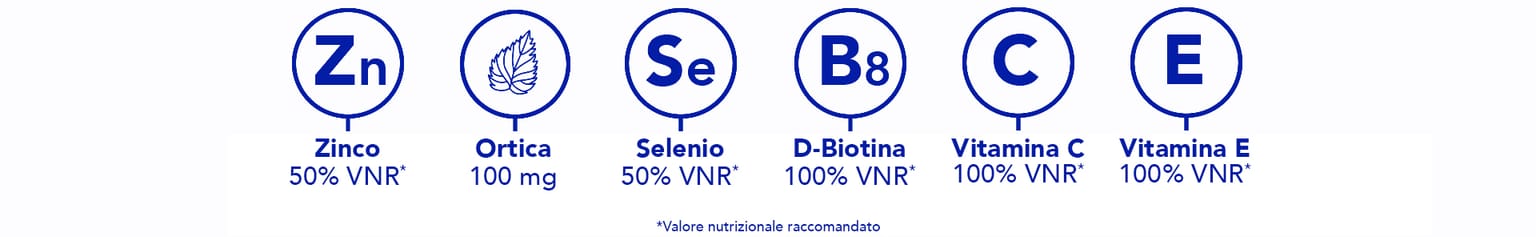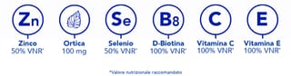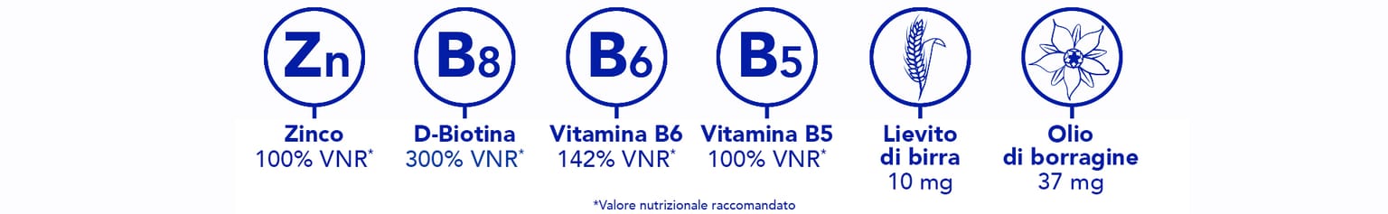 (1)Lo zinco contribuisce al mantenimento di capelli e unghie normali. La vitamina B6 contribuisce alla sintesi normale della cisteina. (2)Lo zinco contribuisce anche a una sintesi proteica normale. (3)Studio clinico, 104 volontari, 3 mesi, 2 capsule al giorno, % di soddisfazione