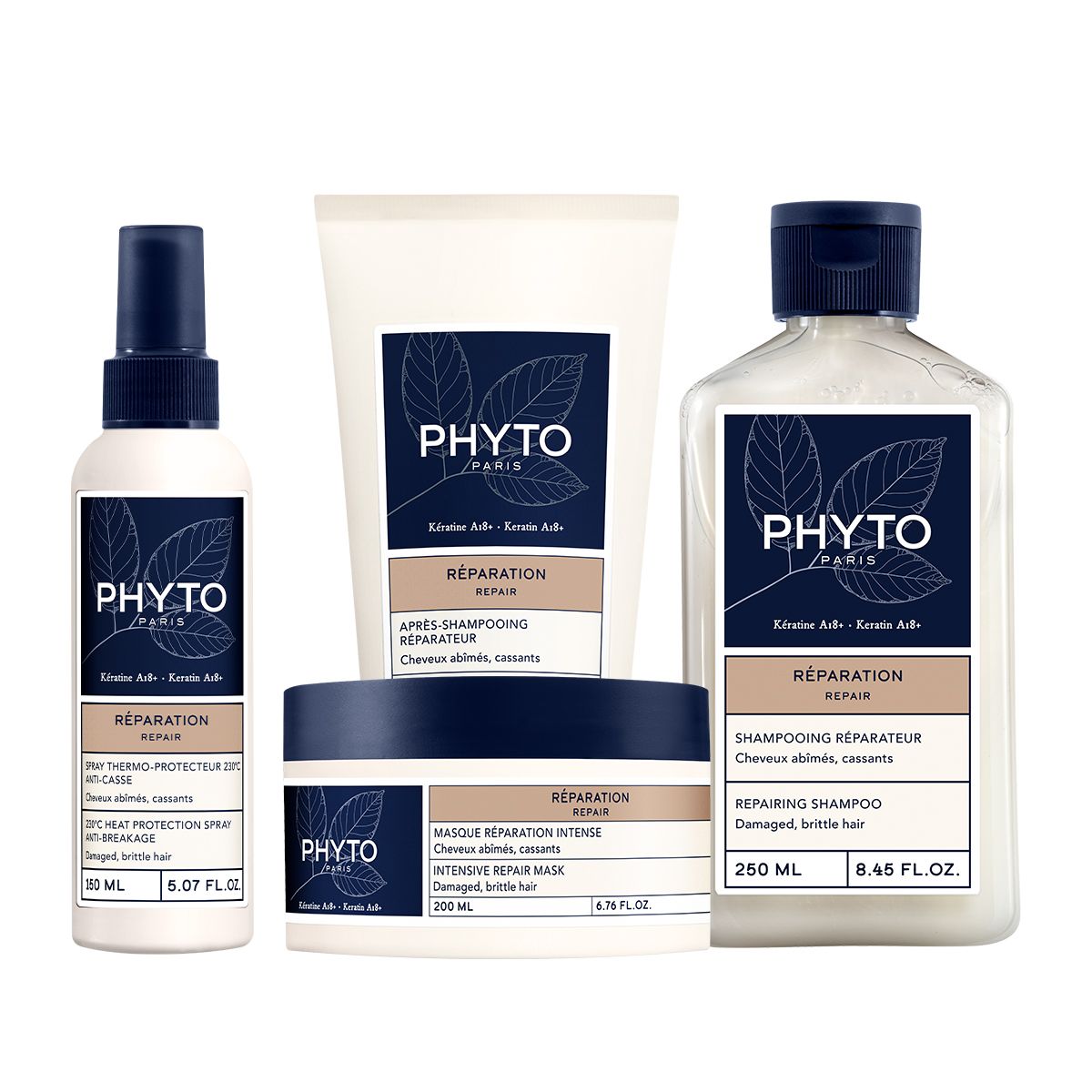 Lo Shampoo RIPARAZIONE condizionante che ripara i capelli danneggiati e fragili. Il Balsamo RIPARAZIONE che ripara e rinforza la fibra capillare, districando. La Maschera RIPARAZIONE che ripristina e rinforza i capelli danneggiati e fragili. Lo Spray Protettivo 230° Anti-Rottura che protegge la fibra capillare dal calore fino a 230°C. Ripara e leviga l'effetto crespo.